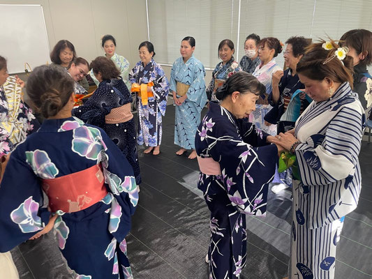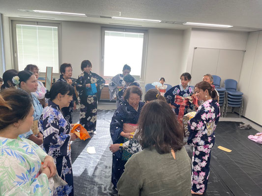 7月9日(日)、日本文化紹介として、浴衣の着付けと盆踊りを体験できるイベントを開催しました。アメリカ、イギリス、タイ、ベトナム、中国、フィリピン出身の外国人の方も含め、29名の皆さんにご参加いただきました。慣れない浴衣の着付けに皆さん苦戦されているようでしたが、周りの方と助け合って帯を結んでいる場面も見られ、とても良い交流の機会になったかと思います。浴衣の着付けが終わった後は、参加者全員で輪になって「茂原音頭」を踊り、お祭り気分でとても楽しいイベントとなりました。参加してくださった皆さま、ありがとうございました!